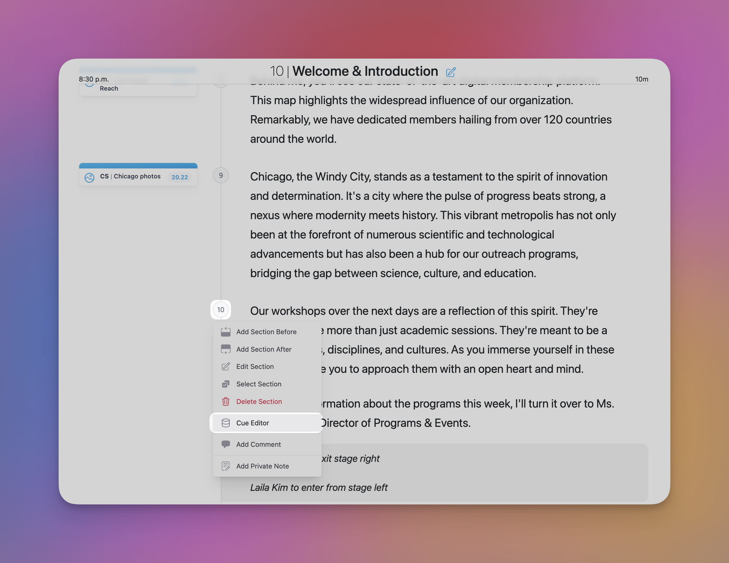 Cues are at the heart of every Script Elephant show. They are what connect the talent-facing spoken word in your script with the direction for your technical team.