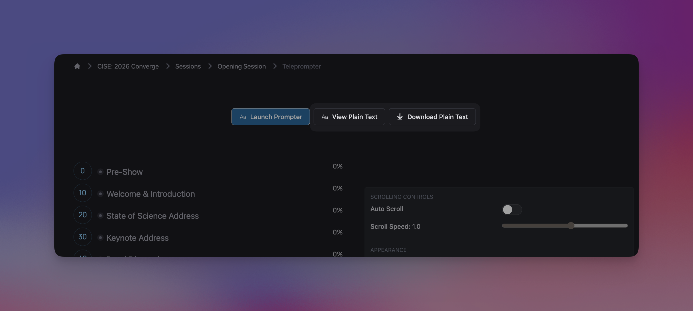 The teleprompter mode supports live show tracking for the operator's dashboard.