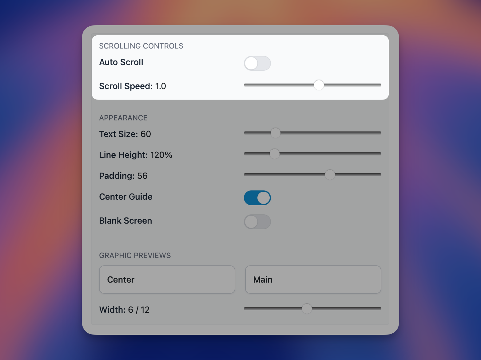 You can enable Auto Scroll from the Scrolling Controls to have the teleprompter scroll down at a consistent speed.