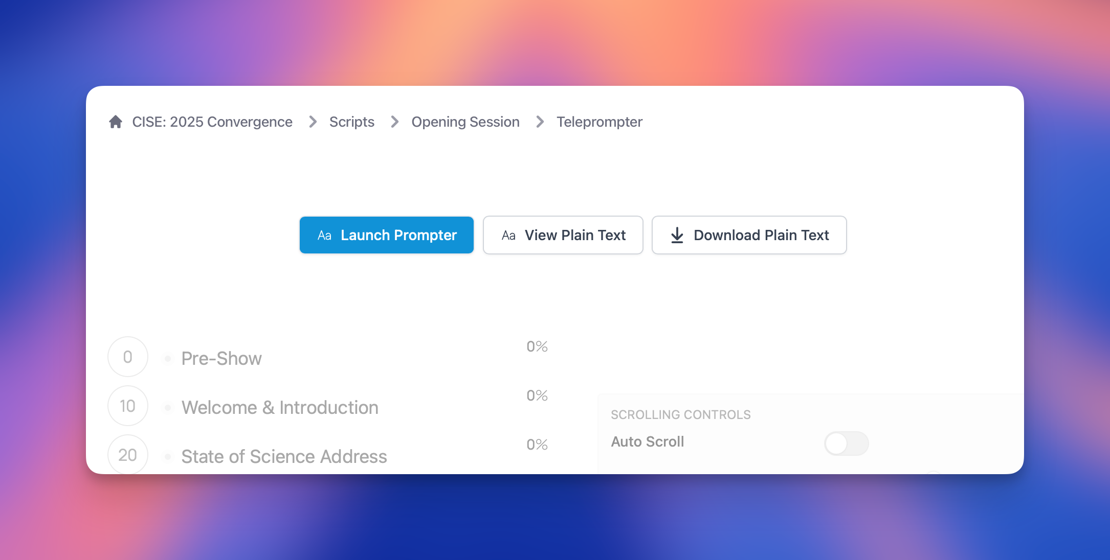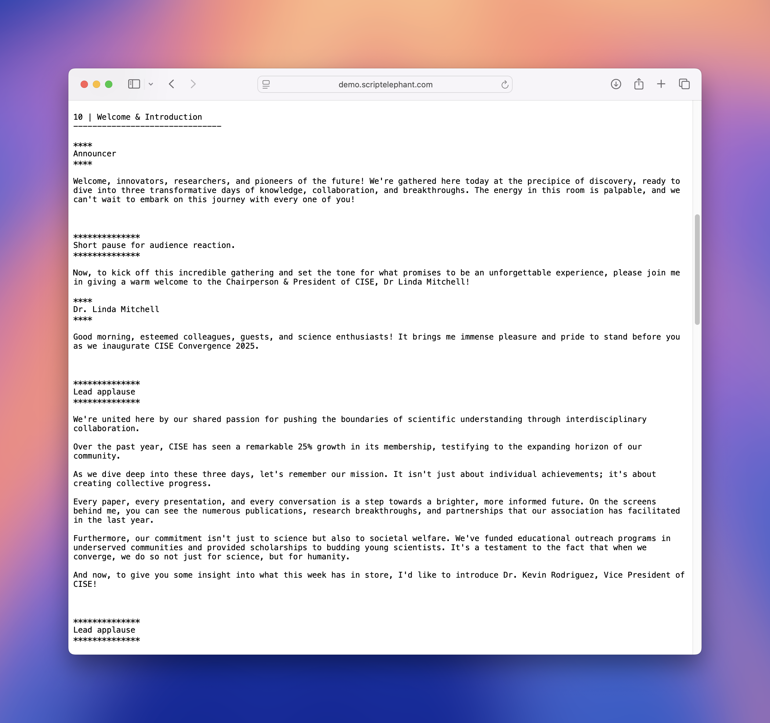 To help you on your day of show, Script Elephant has a built-in Teleprompter Mode. You can also export a text version of your script to import into any teleprompter software of your choice.